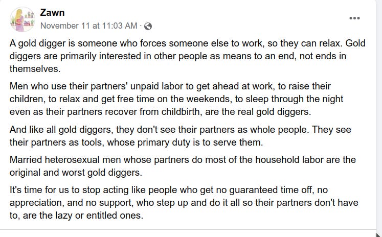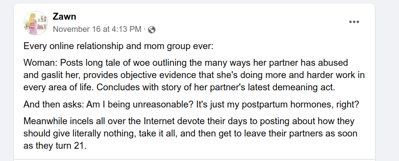 Men’s rights activists aren’t interested in fatherhood, or empowering men, or protecting children, or whatever other nonsense they spew. Their goal is simple: they want men to continue getting away with as little as possible at home. And then they want to ensure women are further punished with economic hardship and time away from their children. They want children with fathers at all costs, even abusive ones.