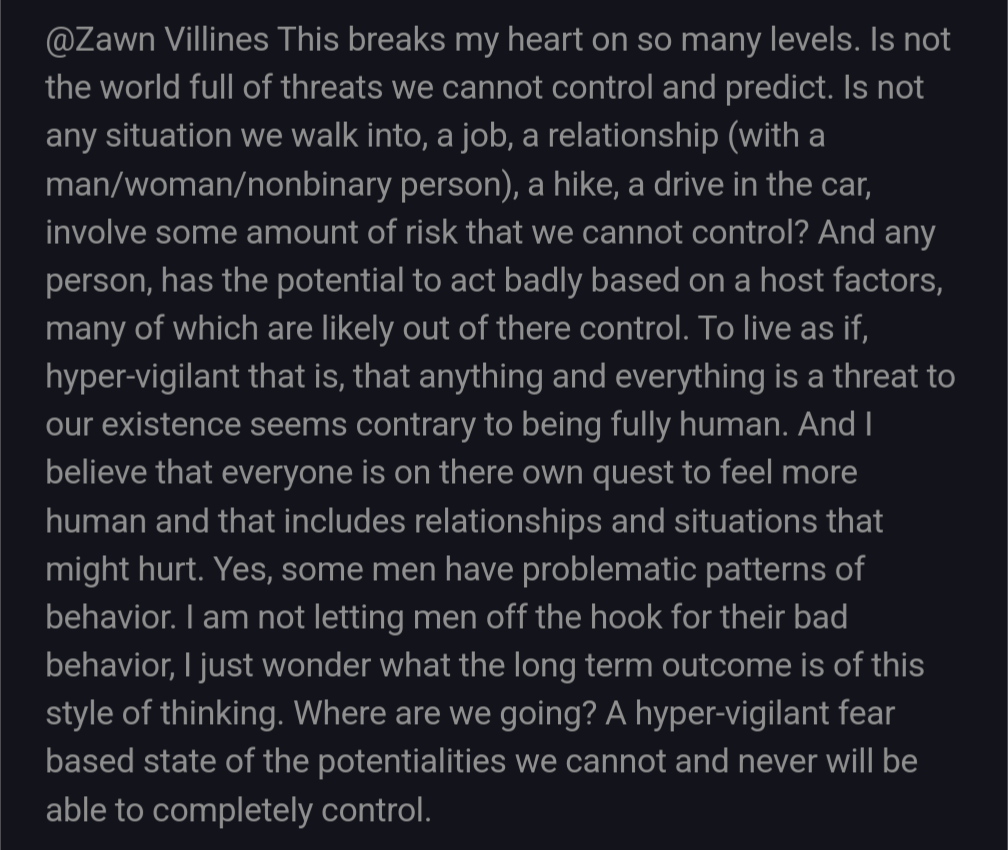 I see it every time I write about women’s fear of men. Some troll dude crawls up from under his bridge to proclaim his heartbreak not that men have made women afraid of them, but that women are vocalizing their fear. This now-deleted comment on this piece is a perfect example of the rhetorical structure of these arguments: