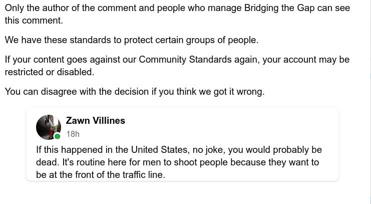 Protecting “certain groups of people,” indeed. Like men. Because no matter how egregious the threats I flag against women are, they never get taken down. There are entire Facebook pages and ecosystems devoted to tearing down women, Black people, immigrants, and other minorities. These are all just fine in the eyes of our censorious overlords.