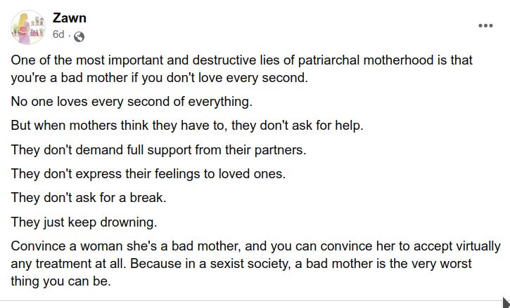 The typical postpartum experience begins with a difficult birth, inadequate support for recovery, and endless demands from family members. When men have medical issues, their partners care for them. When women do, their partners are angry at them for not continuing to do everything. So the typical postpartum woman goes home to a house she’s still expected to clean, to meals she’s still expected to make. To sleeplessness. To a partner who doesn’t care about her emotions or well-being. To kids who need her. And she just can’t do it all.