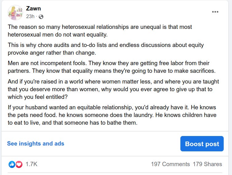 Patriarchy teaches us that women just matter less. It’s completely reasonable for a man to buy his free time and sleep with his partner’s exhaustion, no matter the cost to her or her children. In a patriarchal society, asking men to give something up is unthinkable.
